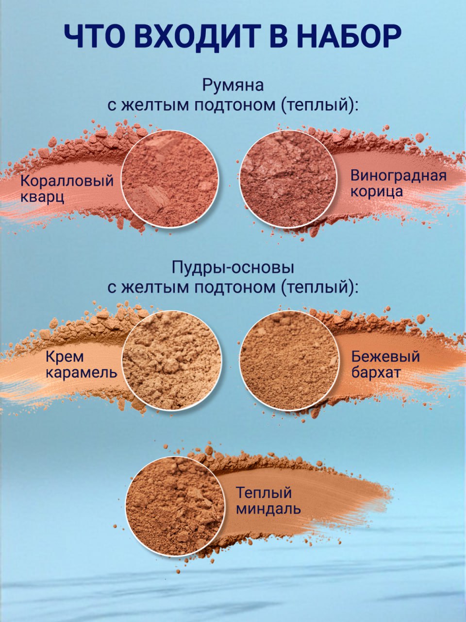 Набор из пяти компонентов: минеральные пудры-основы и румяна с желтым подтоном теплых оттенков. 100% натуральный состав. SPF 10. Пудры-основы выравнивают цвет лица, маскируют недостатки кожи и матируют. Пудра-вуаль прекрасно завершает макияж, фиксирует ровный тон кожи, создавая эффект «макияж без макияжа» и придает коже сияние. Она наносится поверх пудры-основы или используется как самостоятельное средство. С помощью румян можно выделить скулы, визуально изменить форму лица и придать коже свежий сияющий вид.