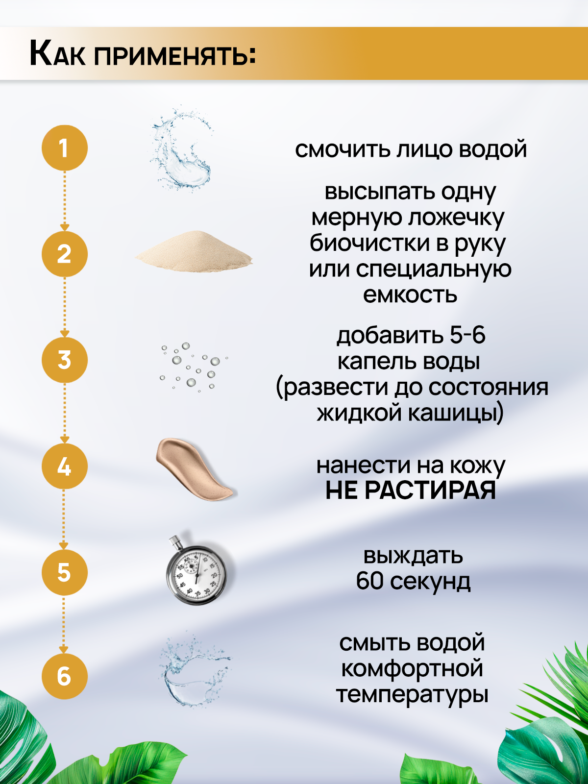 3. Оставить на 30-60 секунд (для ежедневного умывания) или на 1-2 минуты (перед применение маски, крема).