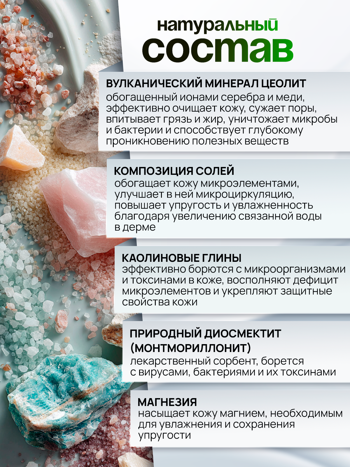 100% натуральный состав: цеолит, обогащенный ионами меди, серебра, цинка, магния и калия; монтмориллонит, глина белая, глина розовая, порошок жемчуга, соль пищевая, соль морская, натуральная морская садочная соль, соль Мертвого моря, озерная соль рапа, сода пищевая, сапропель.