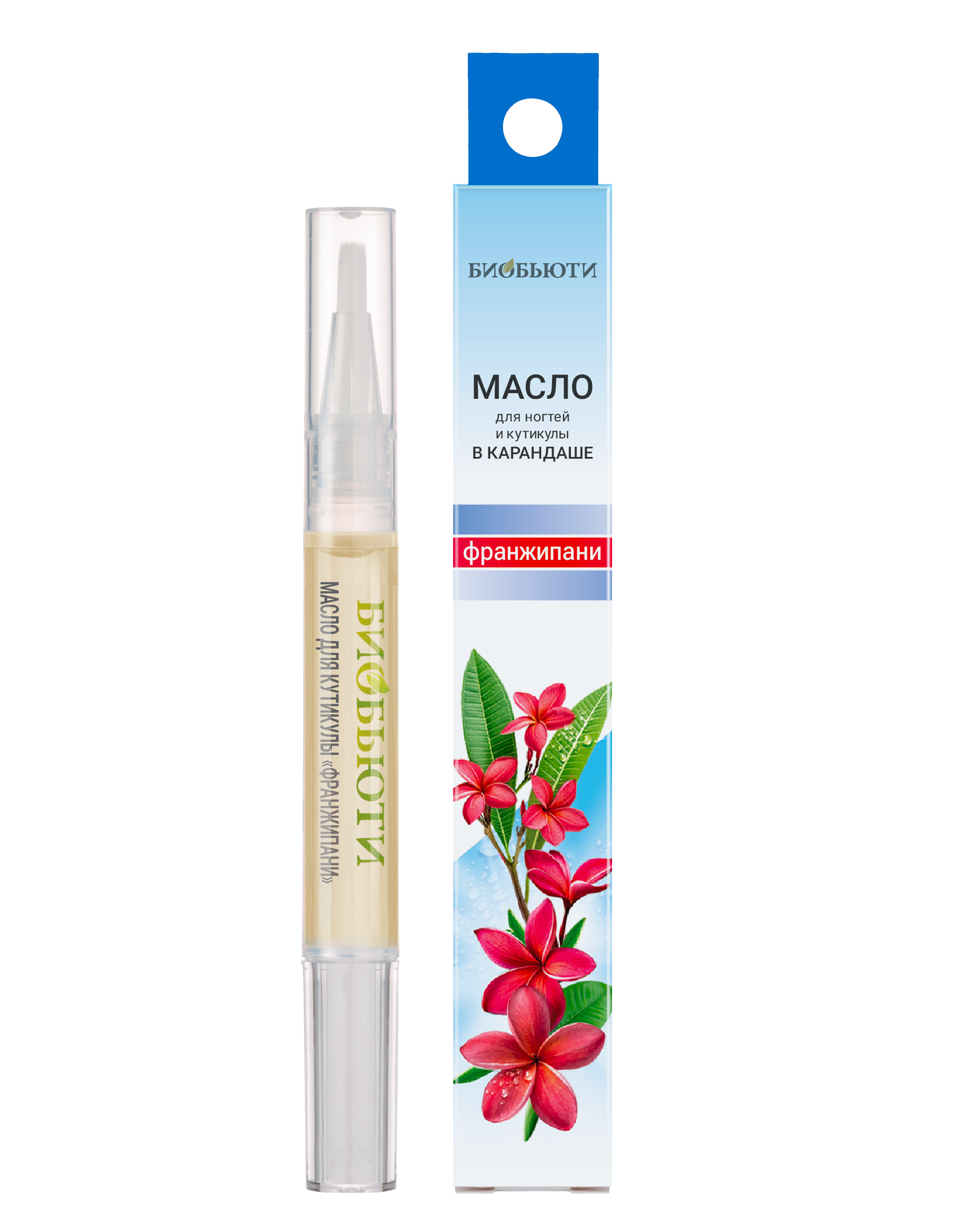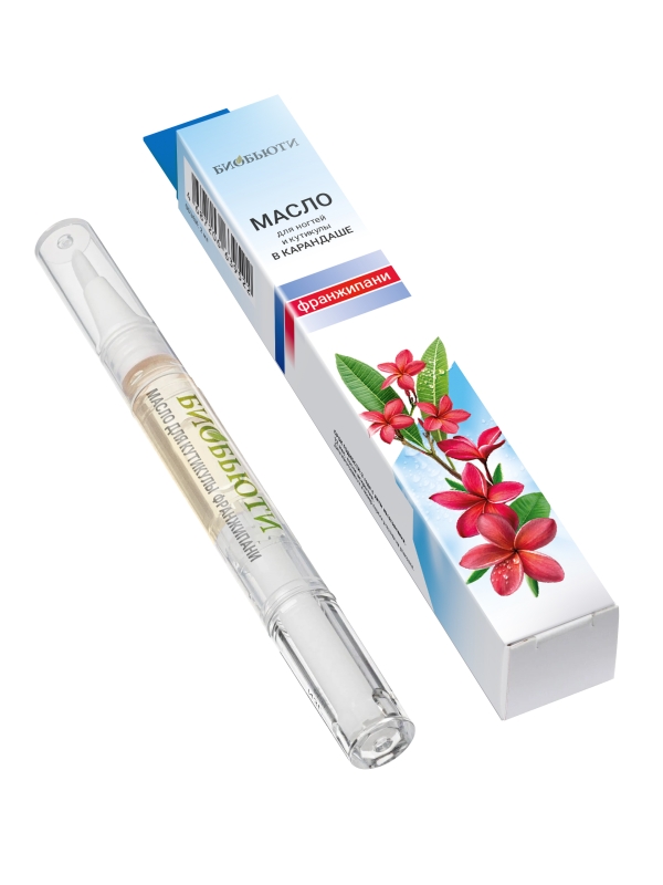Натуральное масло для кутикулы «Франжипани» от БиоБьюти — это многофункциональный продукт. В его состав входят масла миндаля, жожоба и авокадо, а также витамины А и Е. Масло питает и защищает кутикулу от сухости, трещин и заусениц. На ногтях без лака карандаш работает как маска, укрепляя ногтевую пластину и предотвращает ее расслаивание. Ежедневное использование в течение нескольких недель делает кутикулу мягкой и ухоженной, которую больше не требуется обрезать. Аромат франжипани добавляет продукту изысканности.