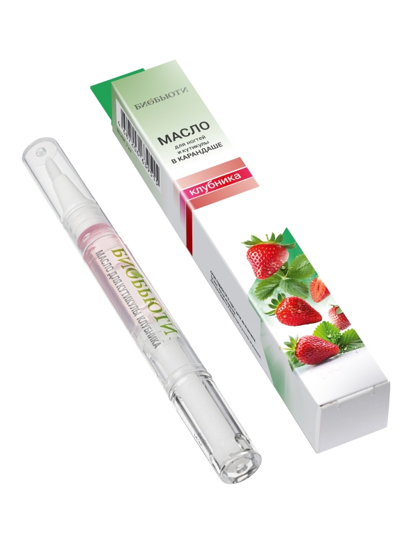 Натуральное масло для кутикулы «Клубника» от БиоБьюти — это многофункциональный продукт. В его состав входят масла миндаля, жожоба и авокадо, а также витамины А и Е. Масло питает и защищает кутикулу от сухости, трещин и заусениц. На ногтях без лака карандаш работает как маска, укрепляя ногтевую пластину и предотвращает ее расслаивание. Ежедневное использование в течение нескольких недель делает кутикулу мягкой и ухоженной, которую больше не требуется обрезать. Масло обладает клубничным ароматом.